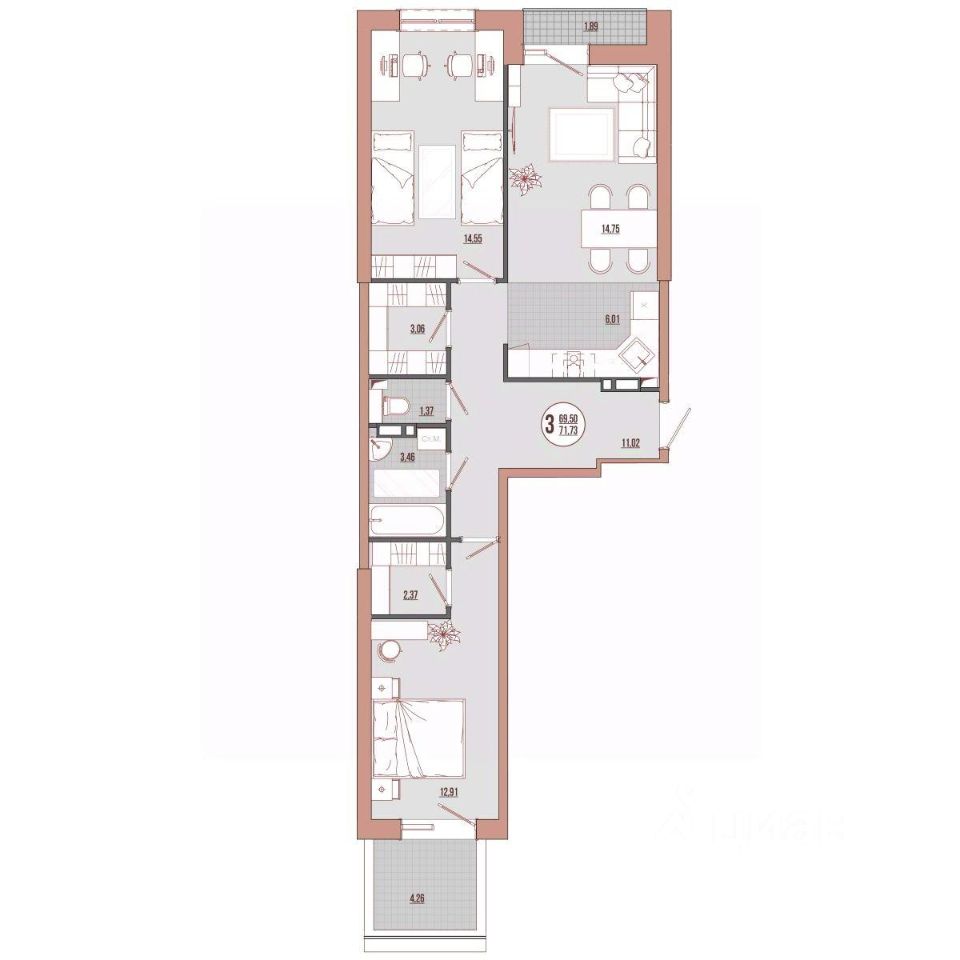 Продаётся 3-комнатная квартира в строящемся доме (Корпус 1), срок сдачи: III-кв. 2026, общей площадью 71.73 кв.м., на 2 этаже. Новый жилой дом от застройщика "СЗ Стоунлэнд" расположен по адресу: Россия, Приморский край, Владивосток, улица Адмирала Юмашева