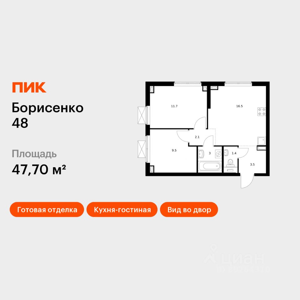 Продаётся 2-комн. квартира площадью 47,7 кв.м на 9 этаже 30 этажного дома (Корпус 4, Секция 4) проекта ПИК Борисенко 48. Светлый просторный подъезд на уровне земли, функциональная планировка, большие окна, c отделкой.