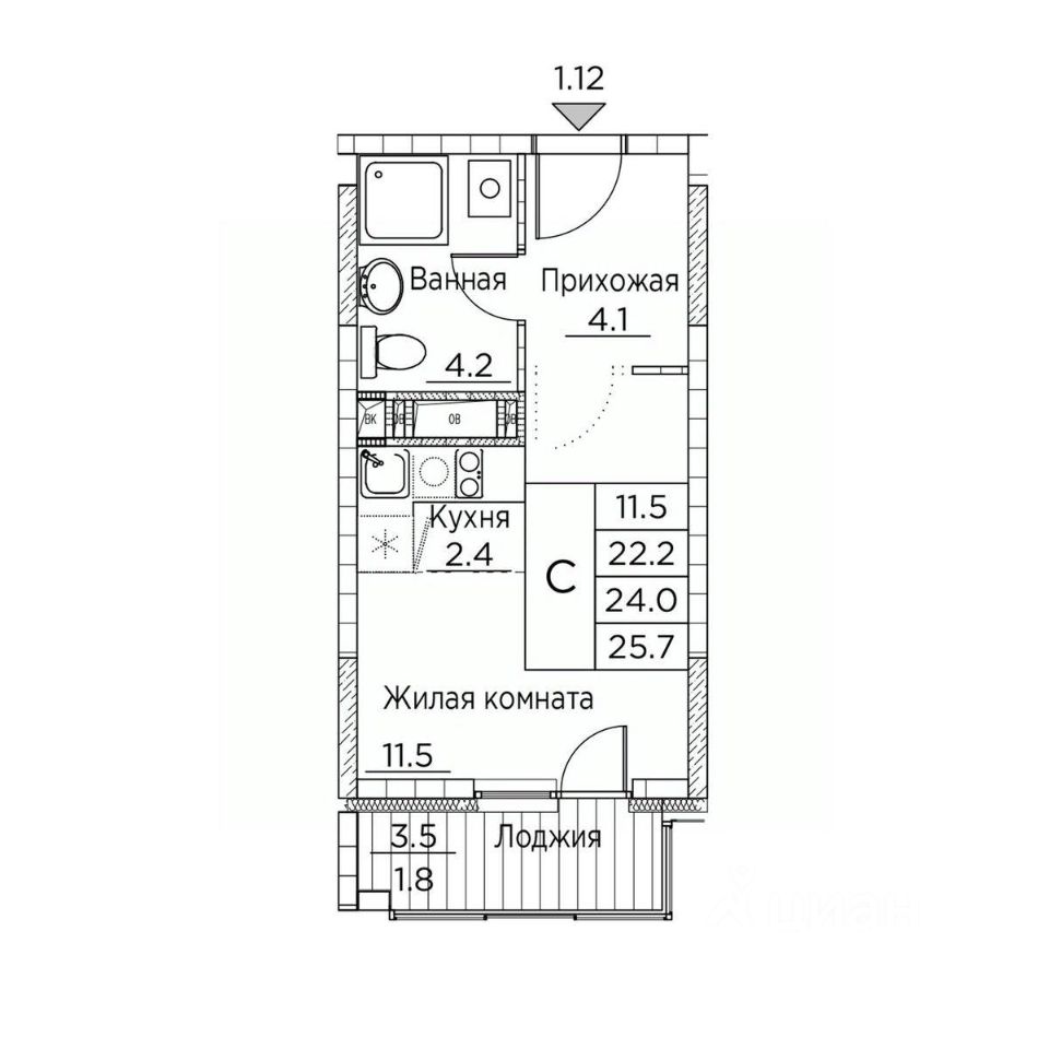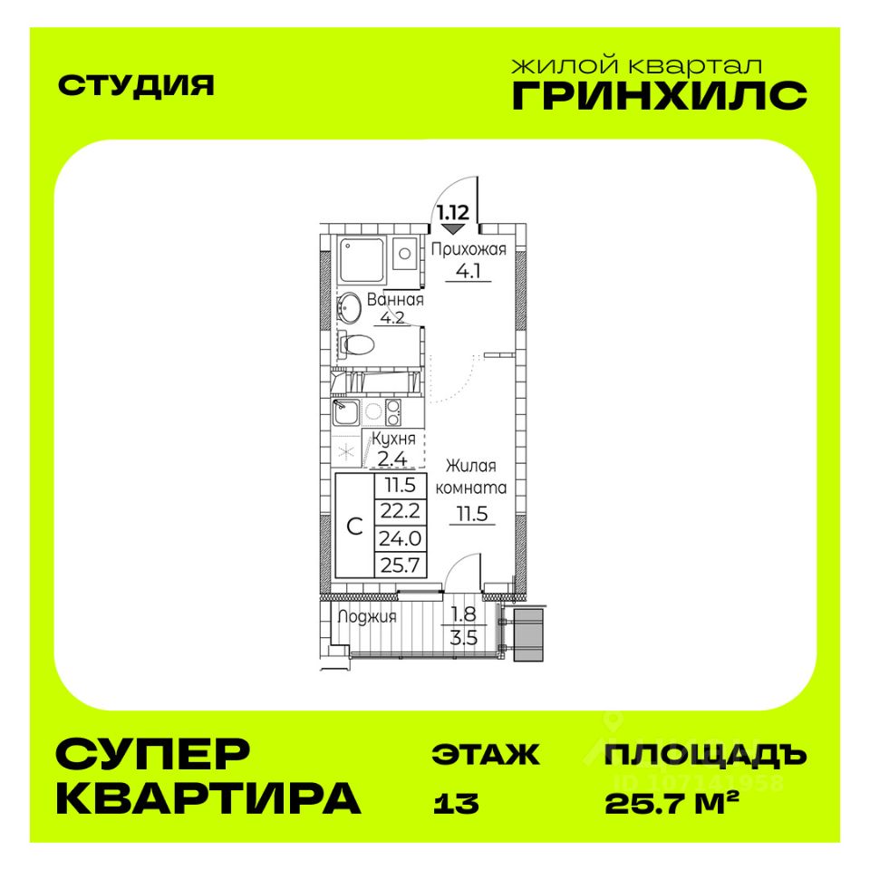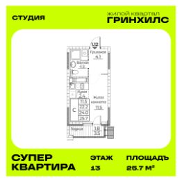 Общая площадь квартиры — 25.7 кв. м, этаж 13 из 20.