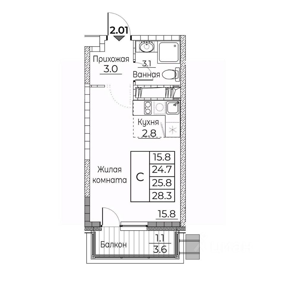 Общая площадь квартиры — 28.3 кв. м, этаж 8 из 23.