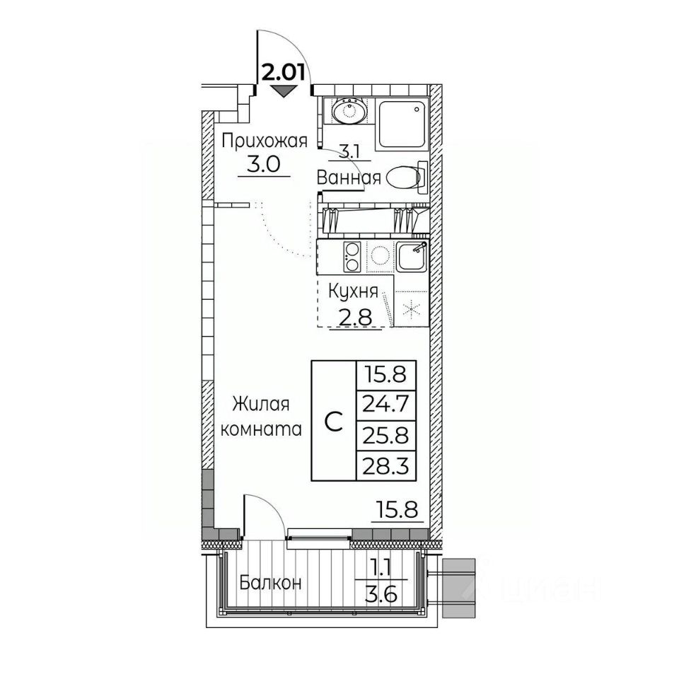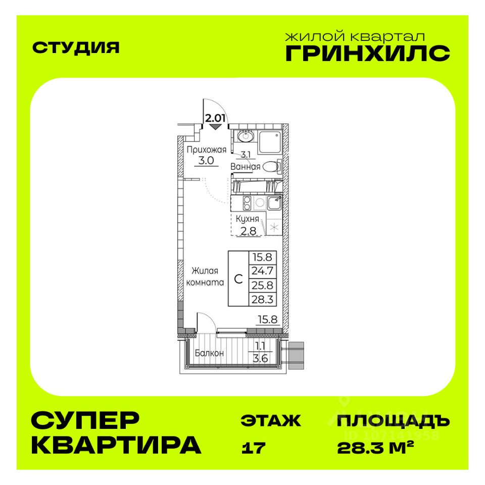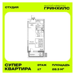Общая площадь квартиры — 28.3 кв. м, этаж 17 из 23.