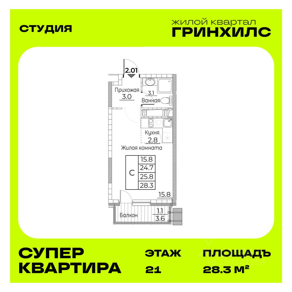Общая площадь квартиры — 28.3 кв. м, этаж 21 из 23.