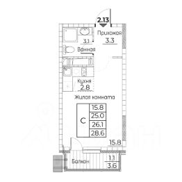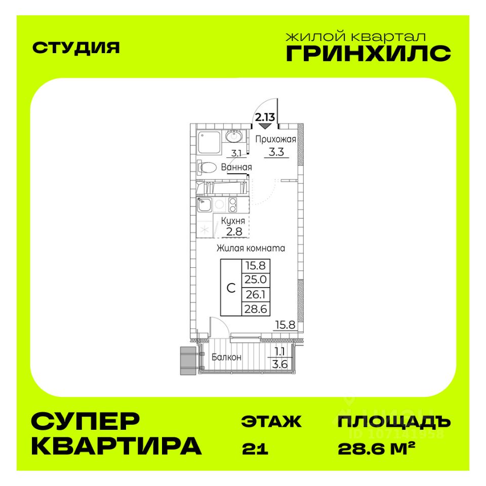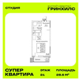 Общая площадь квартиры — 28.6 кв. м, этаж 21 из 23.
