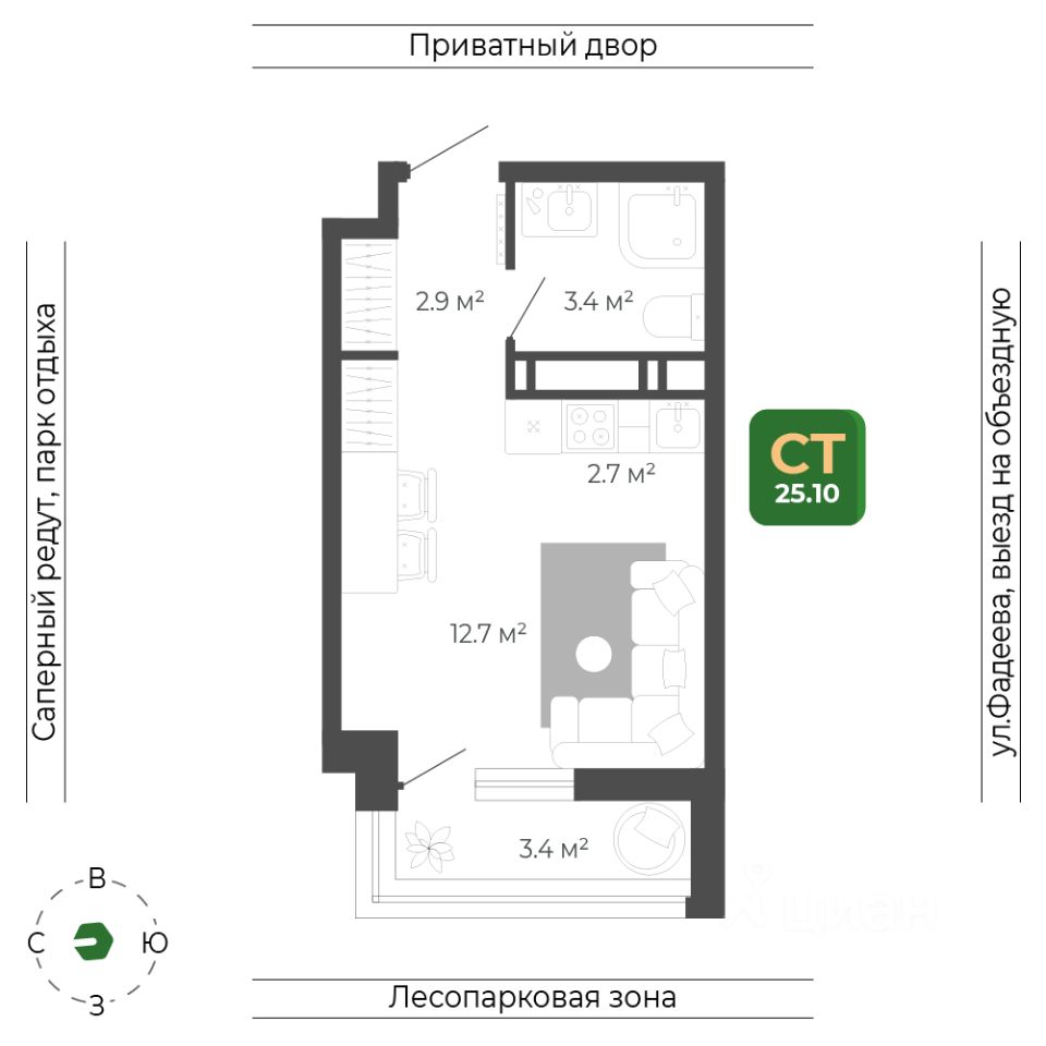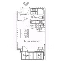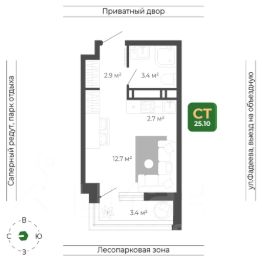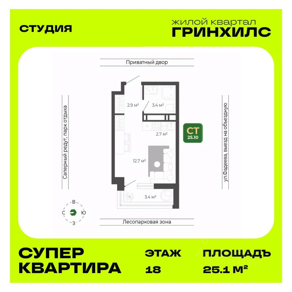 Общая площадь квартиры — 25.1 кв. м, этаж 18 из 19.