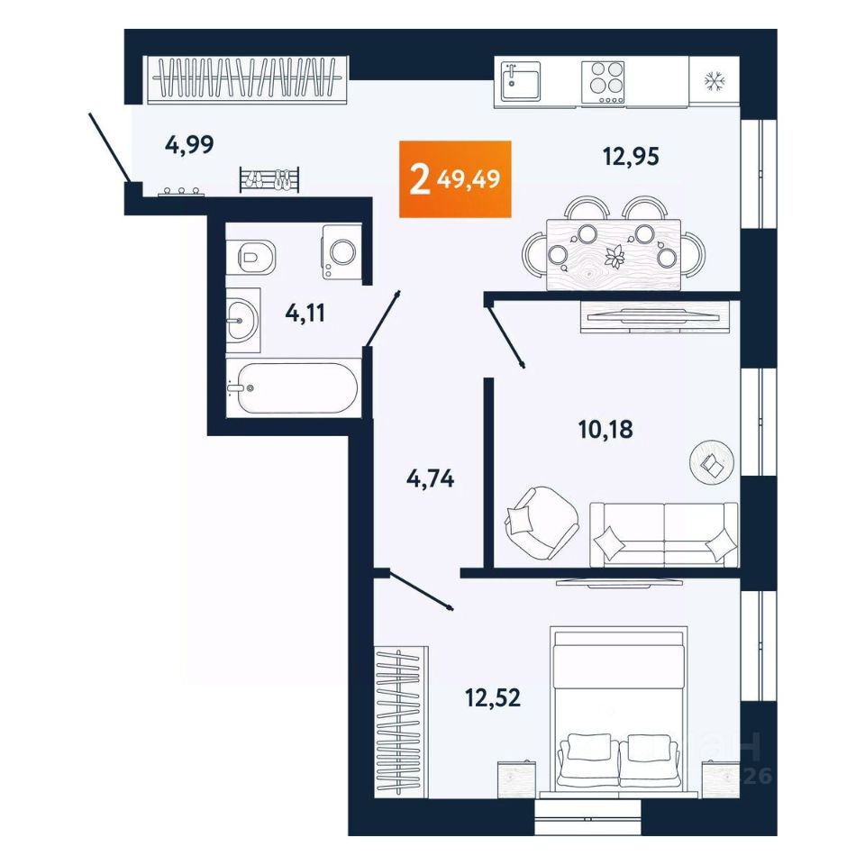 2-комн. квартира, 49,49 м²