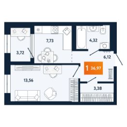 Продаётся 1-комнатная квартира в строящемся доме (Дом 1), срок сдачи: II-кв. 2027, общей площадью 36.97 кв.м., на 21 этаже.