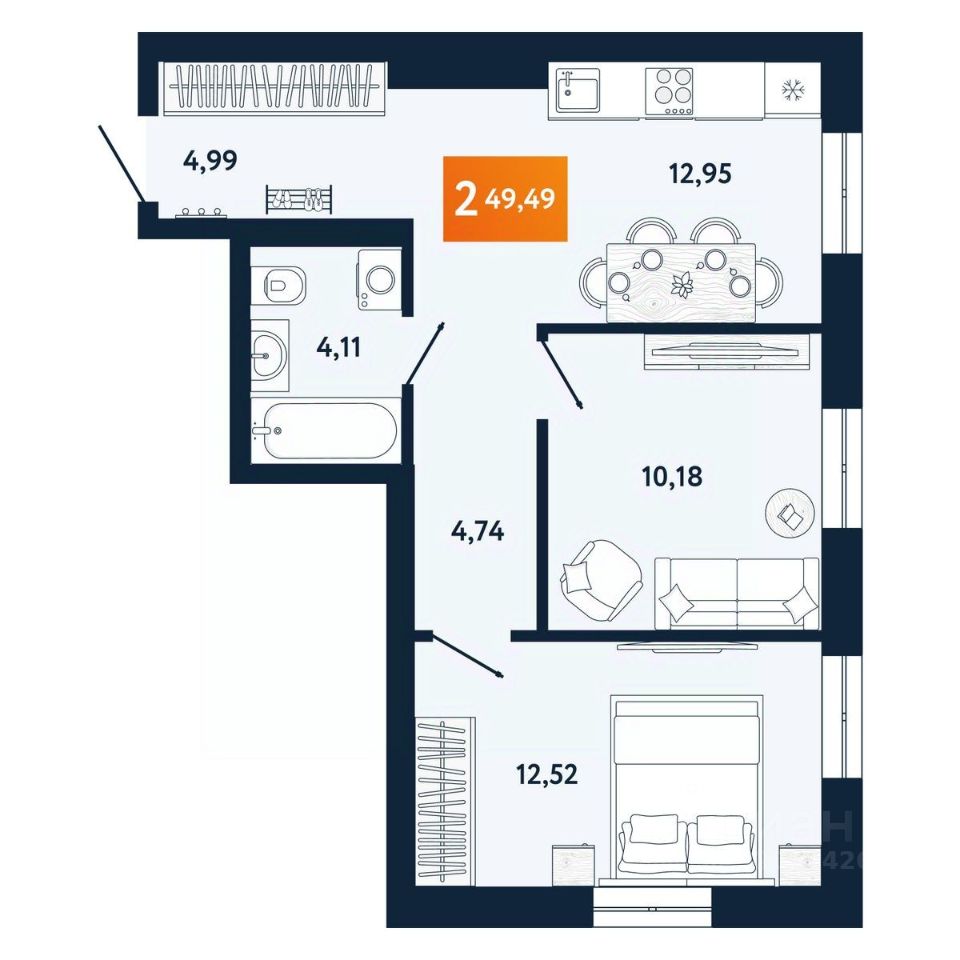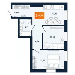 Продаётся 2-комнатная квартира в строящемся доме (Дом 1), срок сдачи: II-кв. 2027, общей площадью 49.49 кв.м., на 4 этаже.