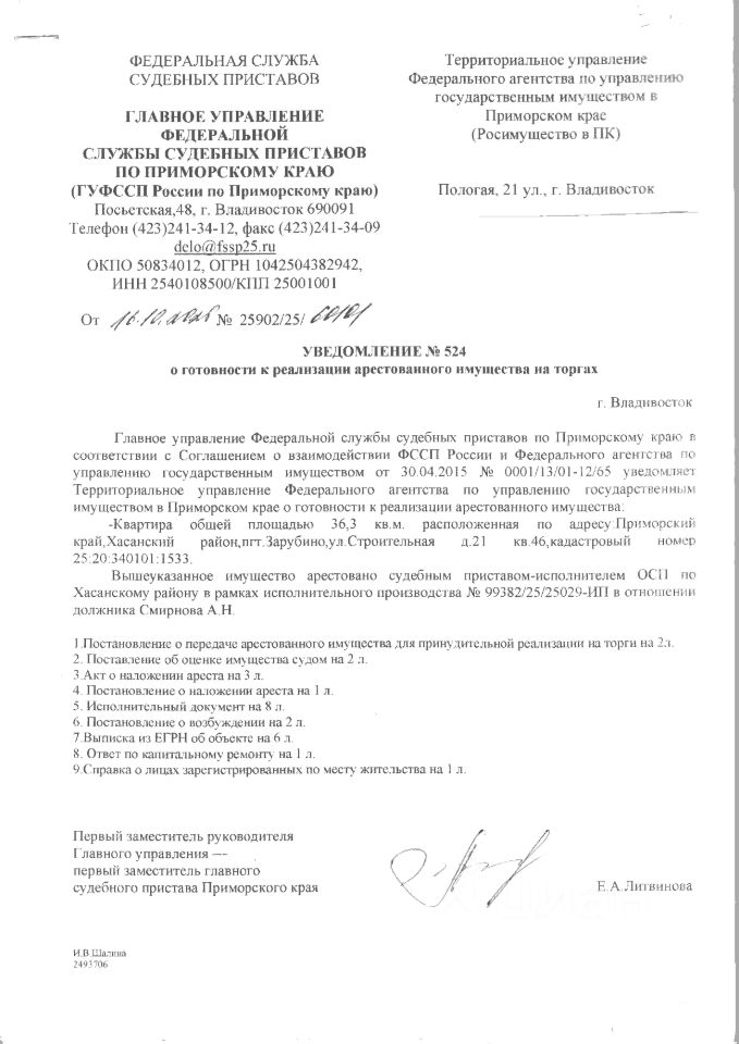 Жилое помещение (квартира) площадью 36,3 кв.м., кадастровый номер 25:20:340101:1533, расположенное по адресу: Приморский край, Хасанский район, пгт Зарубино, ул. Строительная, д. 21, кв. 46, вид права - собственность, сведения о правах и ограничениях (обременениях): 5 записей о запрещении регистрации, ипотека в силу закона от 09.06.2022, по адресу зарегистрирован 1 чел., задолженность по взносам на кап.ремонт а также пеням отсутствует.