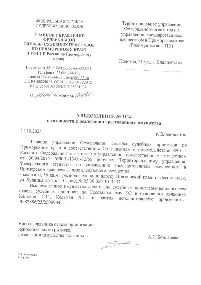 Жилое помещение (2-х комнатная квартира) площадью 56 кв.м., в том числе жилой 28,4 кв.м., кадастровый номер 25:30:020101:4437, расположенное по адресу: Приморский край, г. Лесозаводск, ул. Будника, д. 76, кв. 102, вид права - общая долевая собственность, сведения о правах и ограничениях (обременениях): 9 записей о запрещении регистрации, ипотека в силу закона от 21.11.2008, 3 записи о прочих ограничениях прав и обременениях объекта недвижимости, по адресу зарегистрировано 2 чел., задолженность по взносам на кап.ремонт, а также пеням отсутствует.