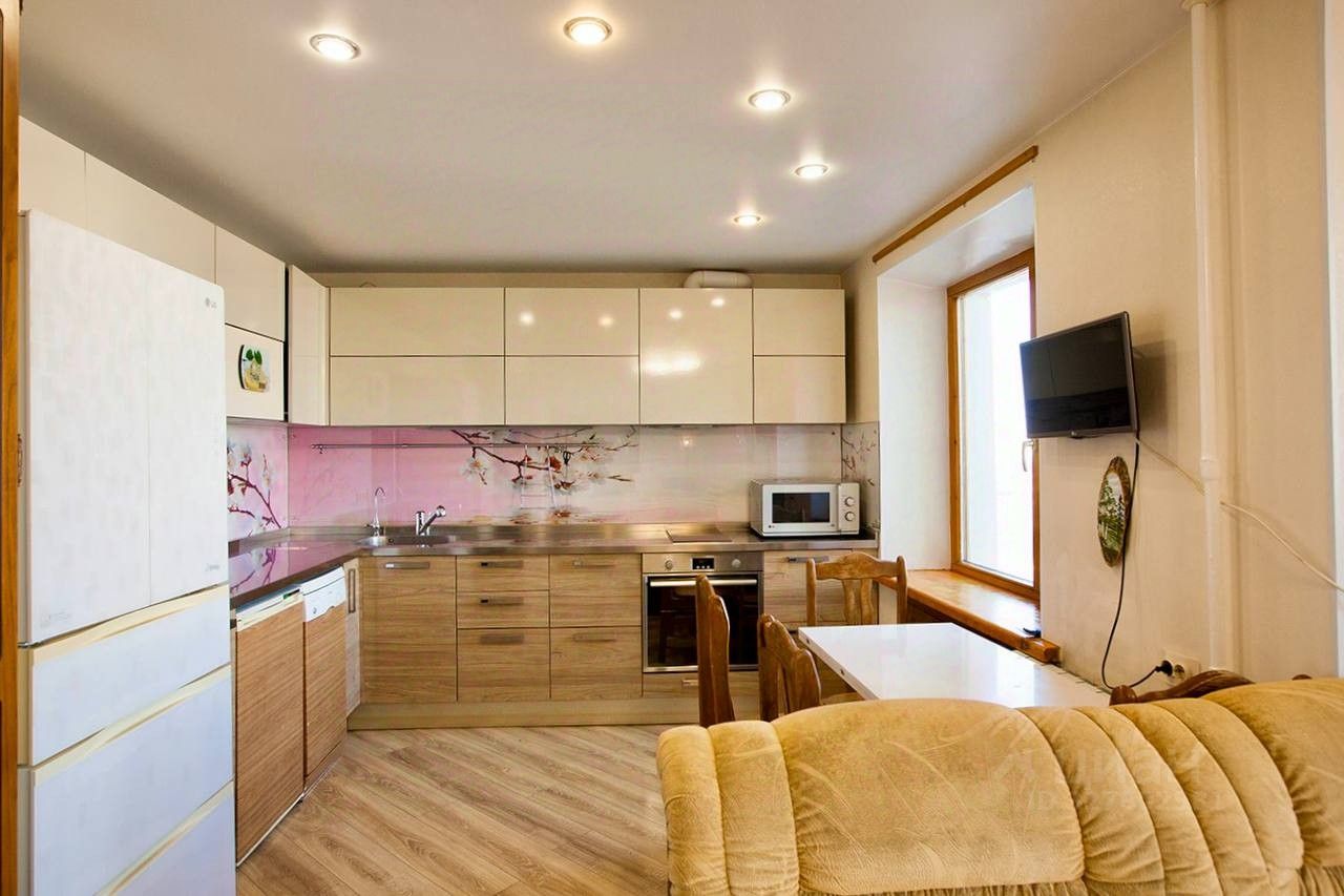 Кухня оборудована современной техникой, включая холодильник и посудомоечную машину.