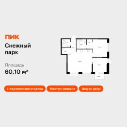 Продаётся 2-комн. квартира площадью 60,1 кв.м на 24 этаже 24 этажного дома (Корпус 2, Секция 2) проекта ПИК Снежный парк. Светлый просторный подъезд на уровне земли, функциональная планировка, большие окна, предчистовая отделка.
