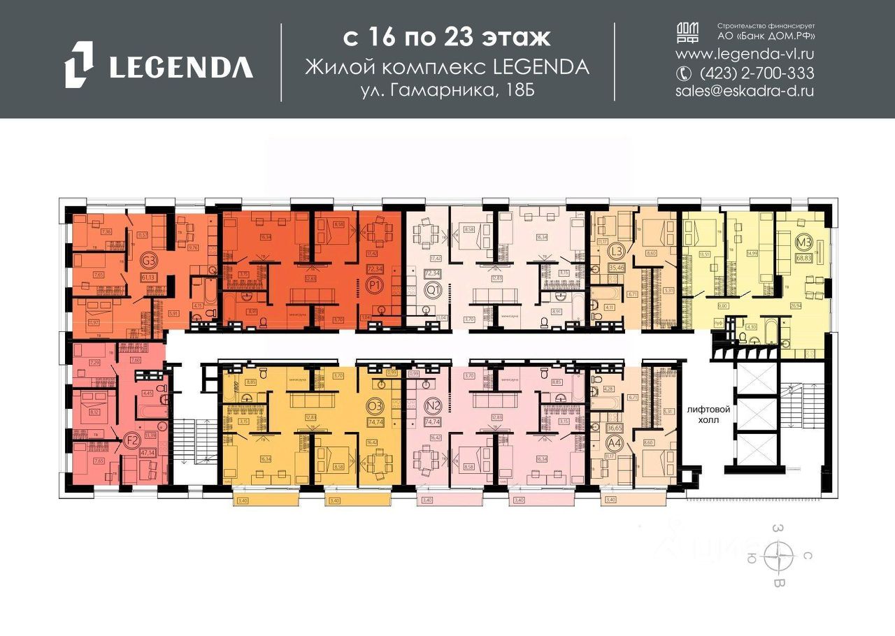 ЖИЛОЙ КОМПЛЕКС ЛЕГЕНДА История комфорта твоей семьи. ЖК "ЛЕГЕНДА" — это камерный жилой комплекс премиального качества, расположенный в одном из самых комфортных и экологически благоприятных районов Владивостока. Это не просто квадратные метры, а приглашение к новому образу жизни, где продуманная архитектура встречается с ежедневной близостью к морю, а высокий статус жилья сочетается с уютом зеленого, тихого района. Это история о переменах к лучшему для вас и вашей семьи. Архитектура комплекса, уникальная для Владивостока, гармонично соединяет классические традиции и современный подход. Качественные материалы отделки фасада подчеркивают высокий уровень проекта. Но главное внутри — пространство, которое дышит свободой. Высота потолков от 2,8 до 3,2 метров наполняет каждую квартиру воздухом и светом, создавая ощущение настоящей роскоши и простора, а панорамные окна открывают захватывающие виды на Амурский залив. ЛОКАЦИЯ. ЗЕЛЕНЫЙ РАЙОН У МОРЯ ЖК "ЛЕГЕНДА" расположен в сердце любимого жителями района Столетия. Это место, где можно наслаждаться тишиной и свежим морским воздухом, не отрываясь от благ цивилизации. Тишина, зелень и море в шаговой доступности. В отличие от шумных магистралей, здесь царит атмосфера курорта и рекреации. При этом район обладает "богатой" и полностью готовой инфраструктурой. В пешей доступности — лучшие школы и детские сады, поликлиники, торговые центры и множество магазинов. Вам не нужно ждать, пока построят социальные объекты — они уже работают и ждут вас. ПРЕИМУЩЕСТВА ЖК ЛЕГЕНДА: ГОТОВОЕ ЖИЛЬЕ У МОРЯ Срок сдачи — II квартал 2026 г. Вы покупаете не обещания на чертежах, а реальный проект, который уже начал подготовку к сдаче. Это значит, что вы получите ключи уже в этом году и сможете начать новую жизнь, не тратя годы на ожидание и съемное жилье. ПОЧЕМУ ЭТО ВЫГОДНО СЕГОДНЯ? Покупать квартиру на стадии бетона и ждать — больше невыгодно. Держать деньги в банке, наблюдая за ростом цен и инфляцией, — тоже невыгодно. Мы предлагаем стоимость квадратного метра как у домов на начальном этапе строительства, но вы получаете готовый продукт уже в 2026 году. Инфраструктура для полноценной жизни: - Закрытая придомовая территория: детские и спортивные площадки расположатся на стилобате дома. Доступ к ним будет только у резидентов, чтобы ваши дети могли гулять в полной безопасности. - Пространство, продуманное до мелочей: четырехуровневый паркинг на 118 мест избавит двор от машин, а прямой доступ на лифте из паркинга в вашу квартиру создаст бесшовный переход ("машина-дом"). Здесь же предусмотрены индивидуальные кладовые для сезонных вещей, шин или спортивного инвентаря, освобождая пространство в квартире. СЕРВИС, БЕЗОПАСНОСТЬ И ЗАБОТА О ВАС Мы создаем условия для вашего спокойствия и комфорта. ЖК "ЛЕГЕНДА" — это безопасная среда для жизни: - Системы безопасности: видеонаблюдение и контроль доступа обеспечивают приватность. - Забота о вас: чтобы ваше новоселье началось с абсолютной чистоты, мы дарим вам сертификат на клининг. Мы це