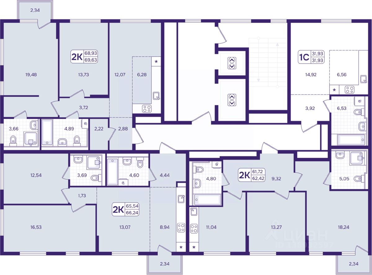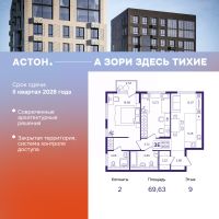 2-комн. квартира в ЖК "Астон. А зори здесь тихие" на 9 этаже. Квартира без отделки, новый владелец может сделать ремонт по своему дизайн-проекту. Общая площадь: 69.63 кв.м., жилая: 33.21 кв.м., площадь просторной кухни-столовой: 18.35 кв.м. Угловая квартира, идеально подойдет любителям тишины и панорамных видов. В квартире один балкон, два совмещенных санузла. Высота потолков 2.87 м.