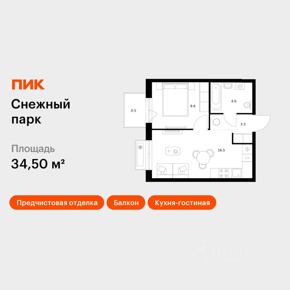 Продаётся 1-комн. квартира площадью 34,5 кв.м на 15 этаже 25 этажного дома (Корпус 3, Секция 1) проекта ПИК Снежный парк. Светлый просторный подъезд на уровне земли, функциональная планировка, большие окна, предчистовая отделка.