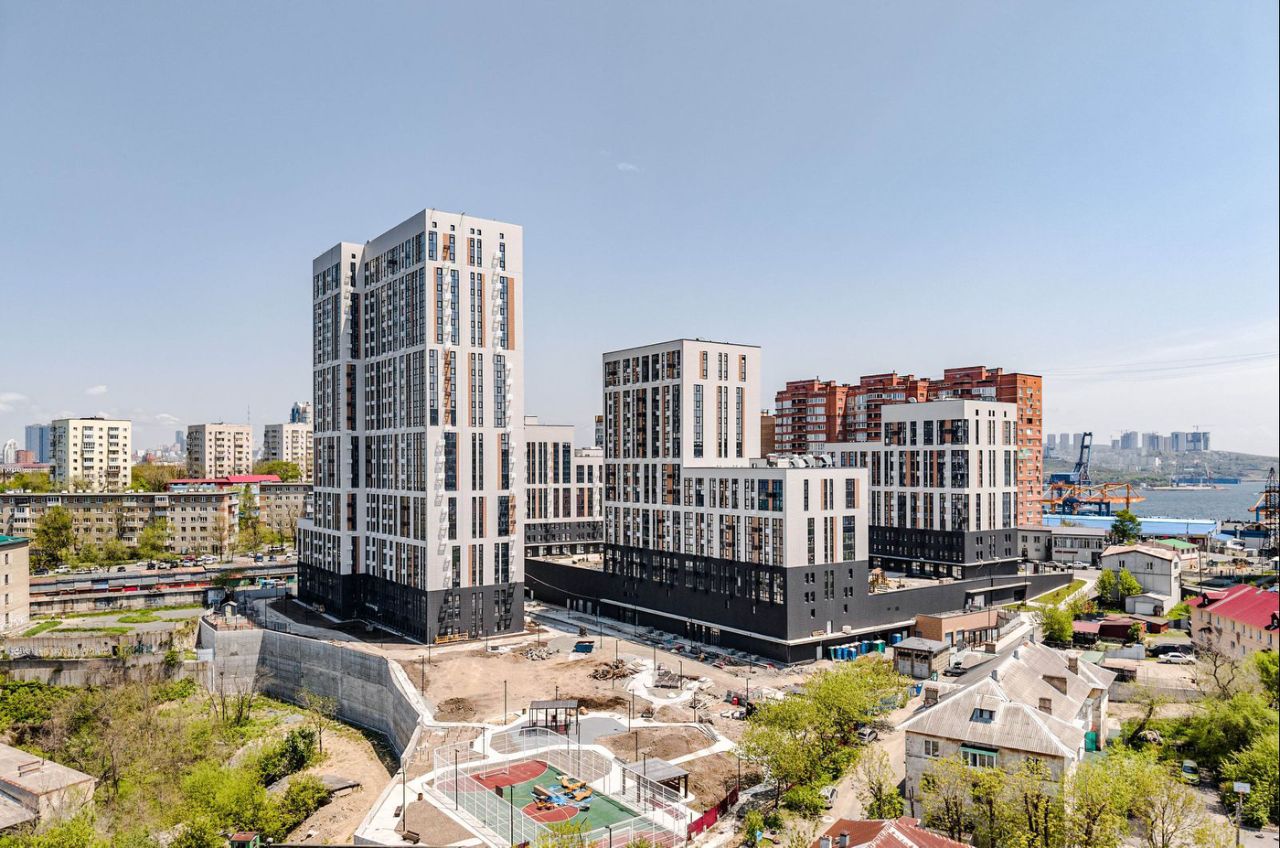Амурский жилой комплекс на берегу Амурского залива в районе Эгершельд, состоящий из нескольких корпусов переменной этажности, собственного паркинга в стилобатной части и комфортабельных общественных пространств.