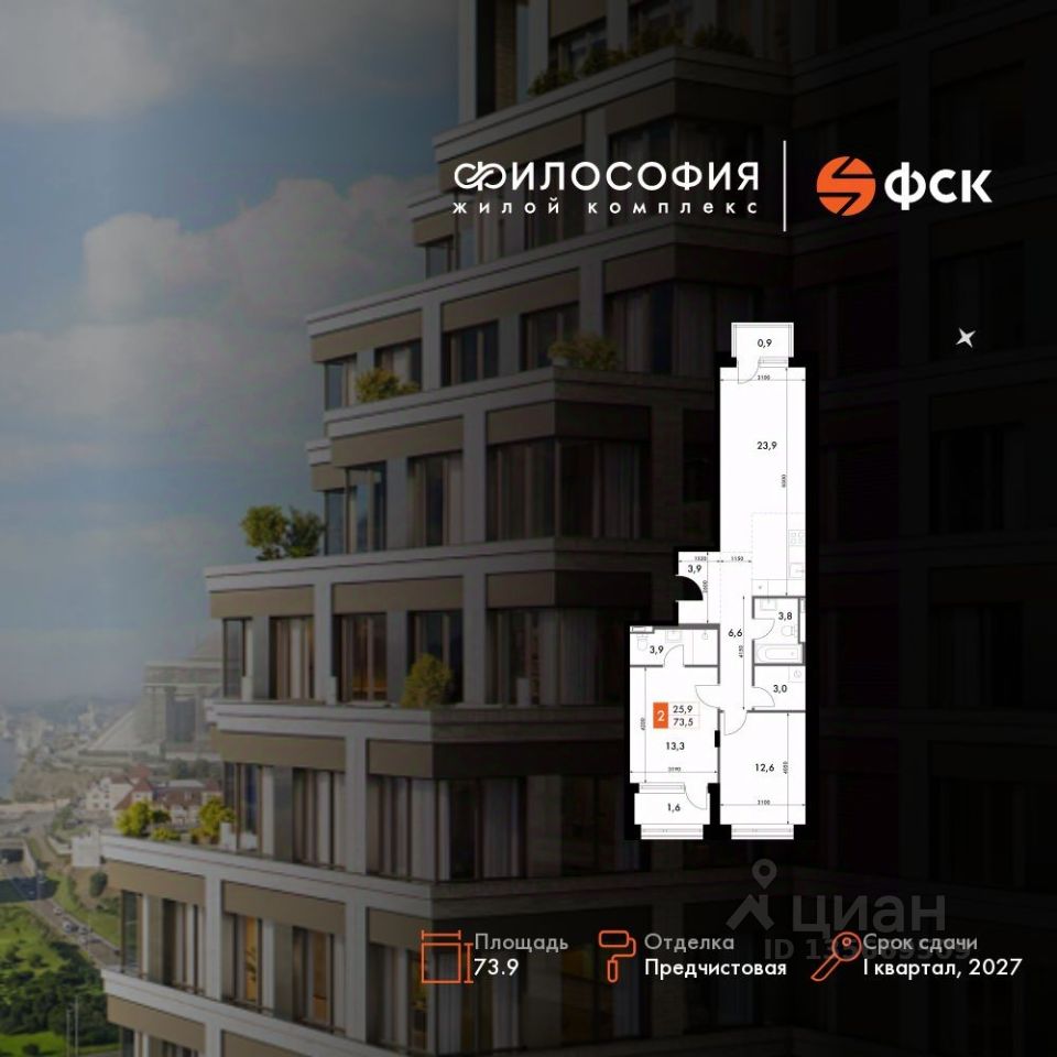 Продаётся 2-к квартира номер 91 общей площадью 73.9 кв.м. на 11-м этаже 14 этажного здания. Предчистовая отделка. Цена с учётом скидки.