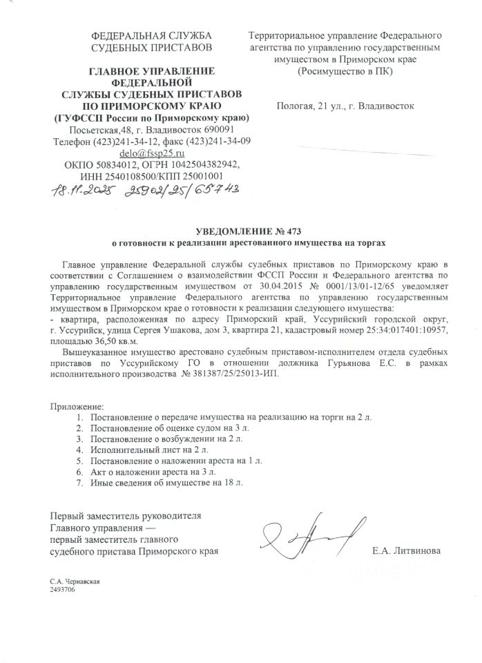 Жилое помещение (квартира) площадью 36,5 кв.м., кадастровый номер 25:34:017401:10957, расположенное по адресу: Приморский край, Уссурийск, ул. Сергея Ушакова, д. 3, кв. 21, квартира находится в залоге, вид права - собственность, сведения о правах и ограничениях (обременениях): 7 записей о запрещении регистрации, ипотека от 20.09.2023, по адресу зарегистрирован 1 чел., задолженность по взносам на кап.ремонт у собственника отсутствует.