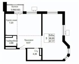 Продаётся 3-комнатная квартира в строящемся доме (Дом 7 (Секция 7.1, 7.2)), срок сдачи: IV-кв. 2027, общей площадью 67.77 кв.м., на 11 этаже.