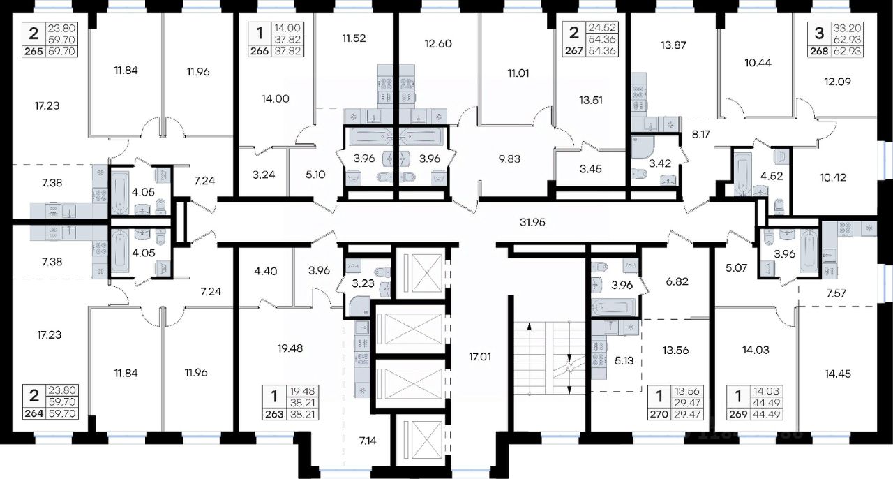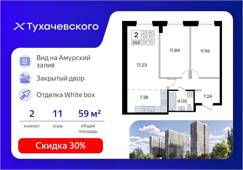 Продается 2-комн. квартира на 11-м этаже в жилом комплексе Тухачевского от GloraX — современном проекте нового формата в престижном районе Владивостока. Общая площадь лота составляет 59,70 кв. м, из которых 23,80 кв. м отведено под жилую и 7,38 кв. м под кухонную зону. Номер квартиры - 265.