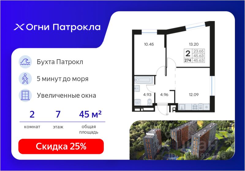 Продается 2-комн. квартира на 7-м этаже в квартале GloraX Клубный. GloraX Клубный - уникальный видовой проект с выделяющейся архитектурой в развитом районе Владивостока. Общая площадь лота составляет 45,63 кв. м, из которых 23,65 кв. м отведено под жилую и 12,09 кв. м под кухонную зону. Номер квартиры - 274.