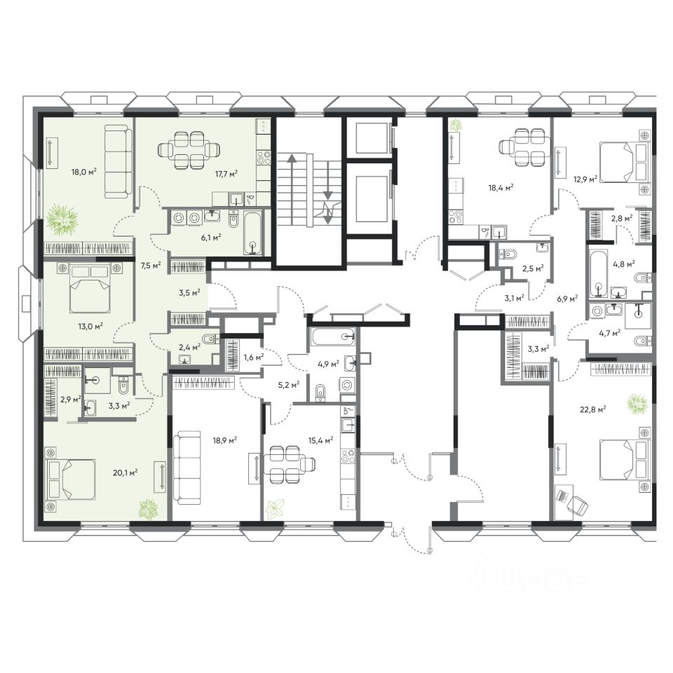 • 4 квартиры на этаже;