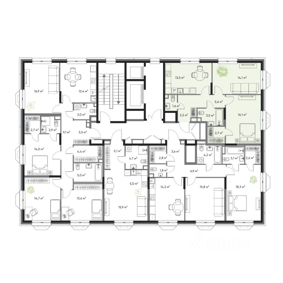 • 4 квартиры на этаже;