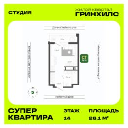 Общая площадь квартиры — 26.1 кв. м, этаж 14 из 22.