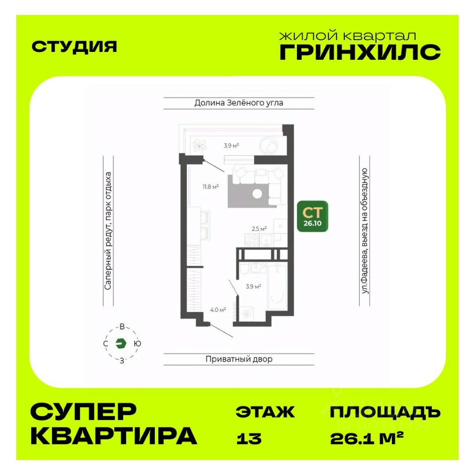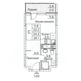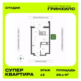 Общая площадь квартиры — 26.1 кв. м, этаж 13 из 22.