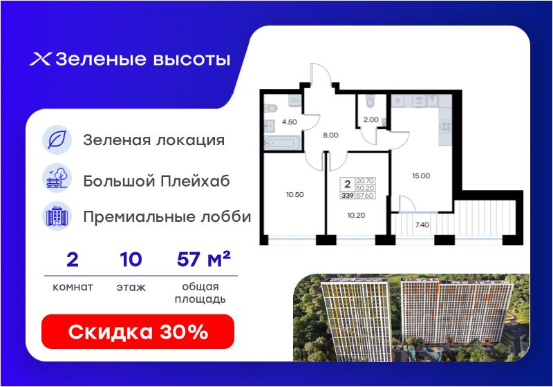 Продается 2-комн. квартира на 10-м этаже в жилом квартале Зелёные высоты от GloraX — проекте в тихой зелёной локации. Общая площадь квартиры 57,60 кв. м, из которых 20,70 кв. м включая 20,70 кв. м жилого пространства и 15,00 кв. м кухни. Номер квартиры - 339.