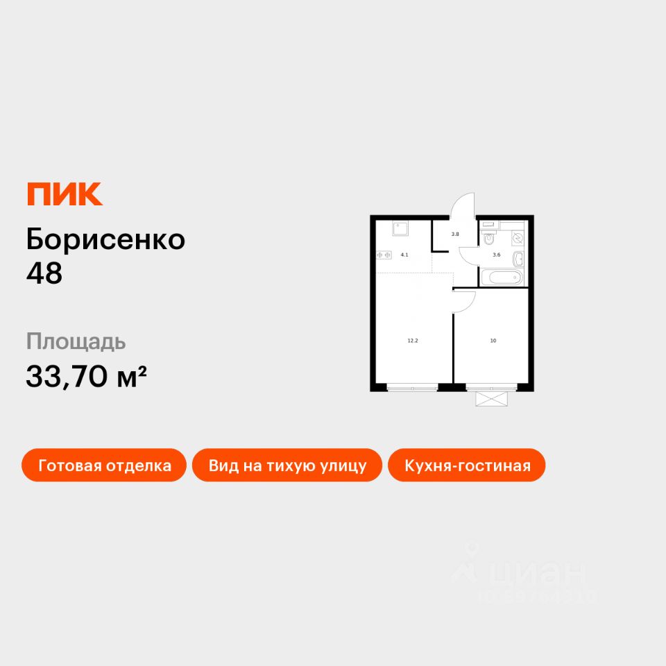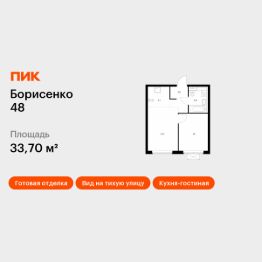 Продаётся 1-комн. квартира площадью 33,7 кв.м на 13 этаже 17 этажного дома (Корпус 1, Секция 1) проекта ПИК Борисенко 48. Светлый просторный подъезд на уровне земли, функциональная планировка, большие окна, c отделкой.