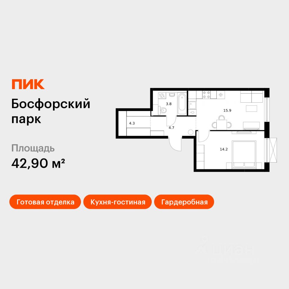 Продаётся 1-комн. квартира площадью 42,9 кв.м на 2 этаже 9 этажного дома (Корпус 6, Секция 1) проекта ПИК Босфорский парк. Светлый просторный подъезд на уровне земли, функциональная планировка, большие окна, c отделкой.