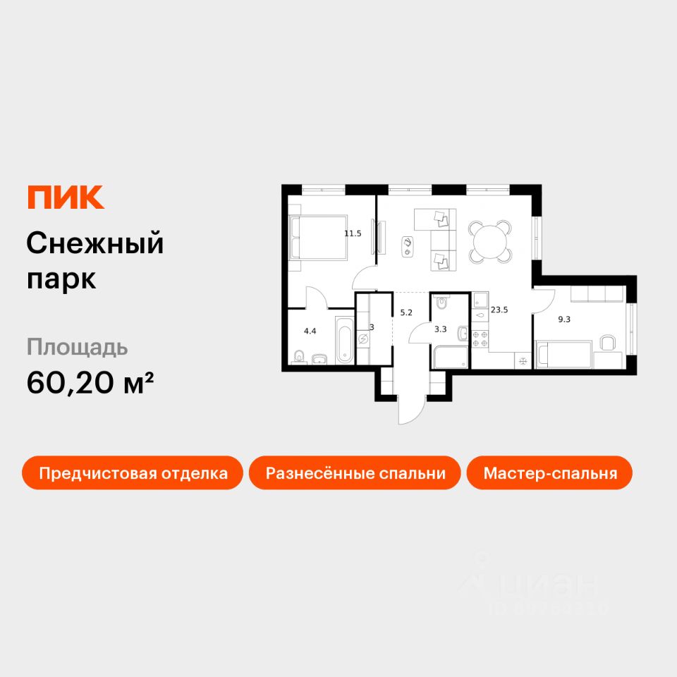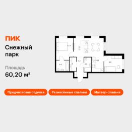 Продаётся 2-комн. квартира площадью 60,2 кв.м на 25 этаже 25 этажного дома (Корпус 3, Секция 1) проекта ПИК Снежный парк. Светлый просторный подъезд на уровне земли, функциональная планировка, большие окна, предчистовая отделка.