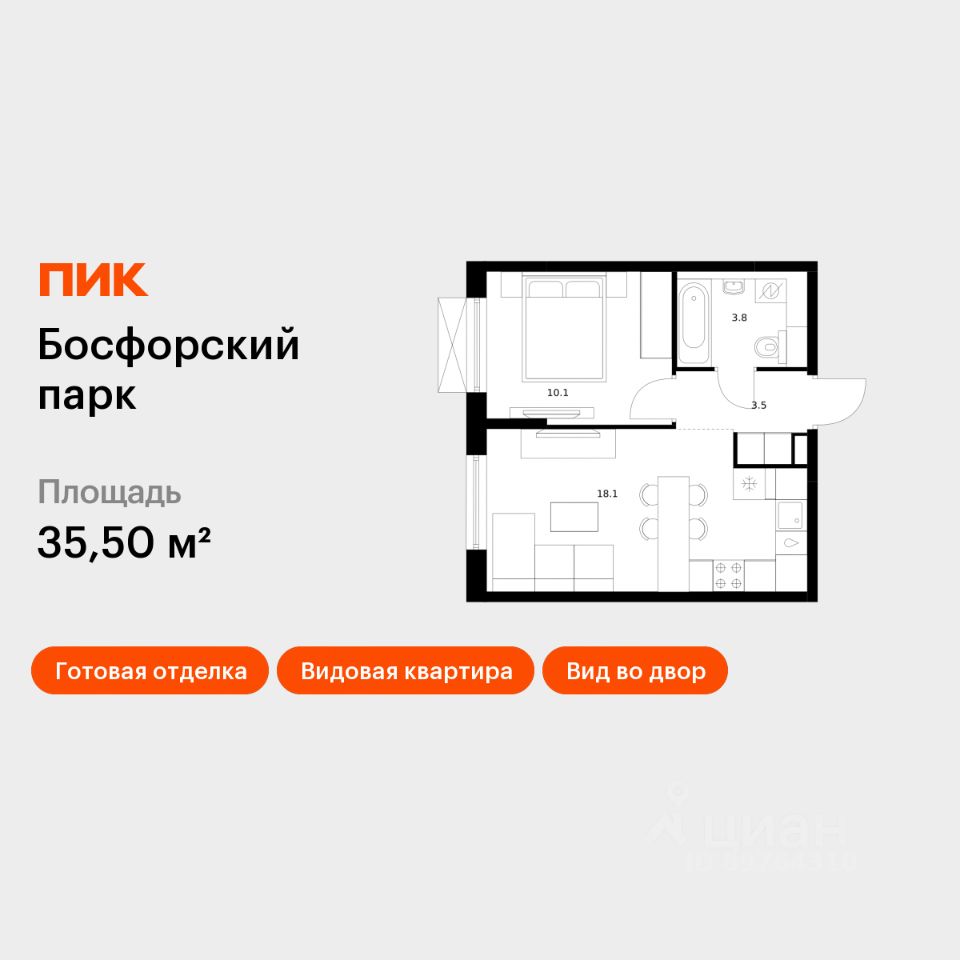 Продаётся 1-комн. квартира площадью 35,5 кв.м на 6 этаже 9 этажного дома (Корпус 6, Секция 1) проекта ПИК Босфорский парк. Светлый просторный подъезд на уровне земли, функциональная планировка, большие окна, c отделкой.
