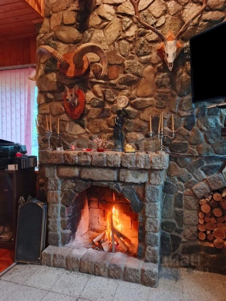 В гостиной камин, работающий на дровах, сделан из царского гранита, отделан финской брусчаткой