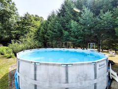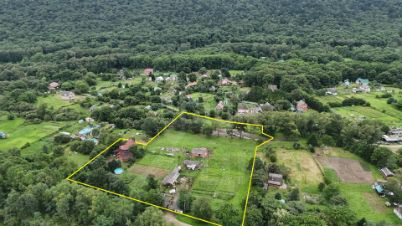 На земле площадью 13241 кв.м. располагается двухэтажный дом с навесом, площадь 200,7 кв.м., бассейн, зона отдыха, на отдалении от хозяйского дома есть дом для рабочего персонала 33,7 кв.м., гараж, летняя кухня, огород, капитальный сарай 6х10 м для содержания животных. По краю заднего двора протекает ручей, там же расположена небольшая роща.