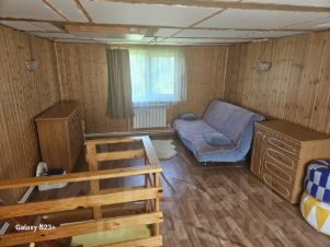 2-ой этаж- жилой. Построен из сэндвич-панелей, дерева, утеплён каменной ватой. Пол из ангарской сосны, сверху линолеум. Для комфортного доступа на мансарду имеется складная лесница, вмонтированная в потолок.