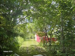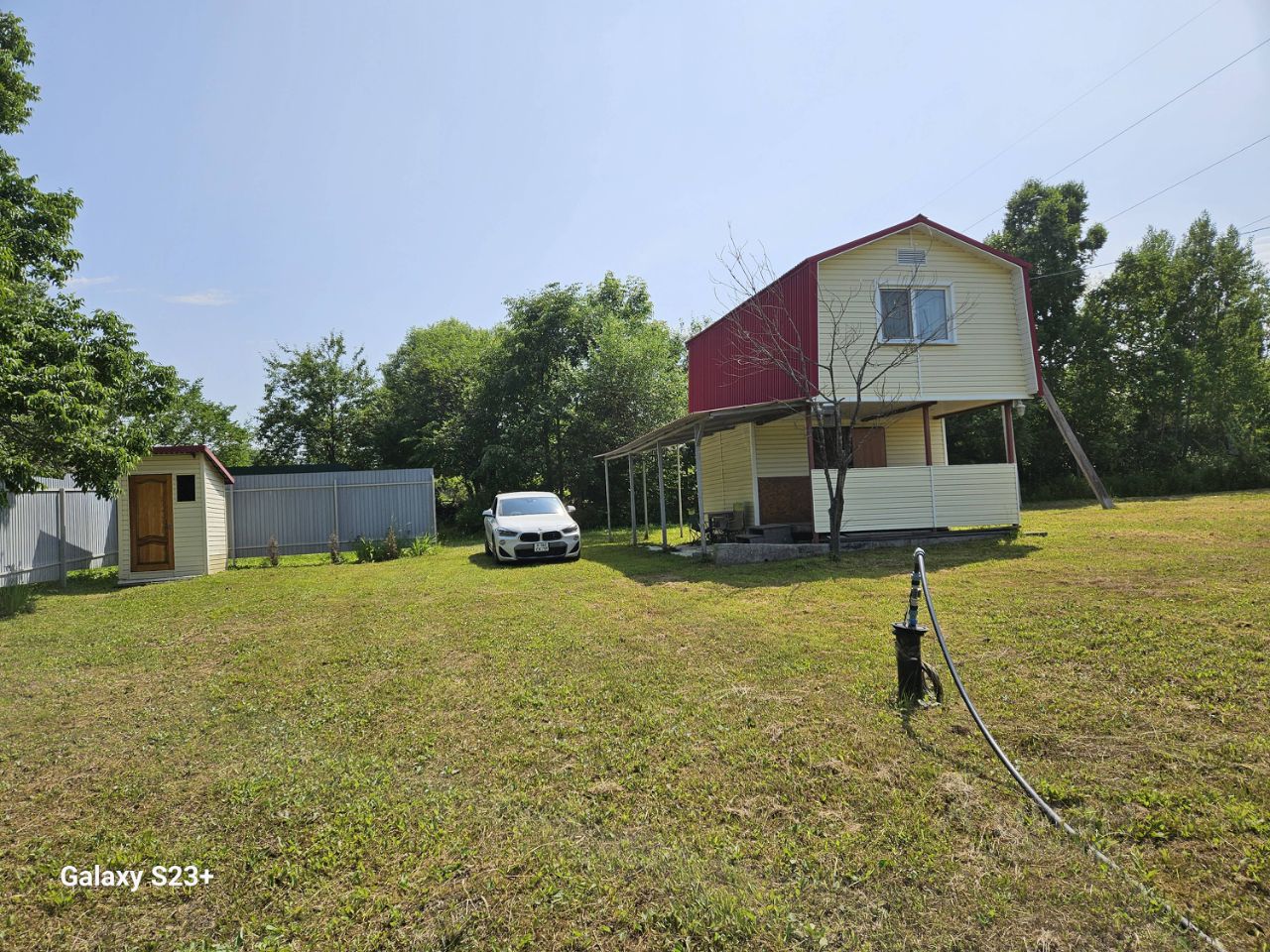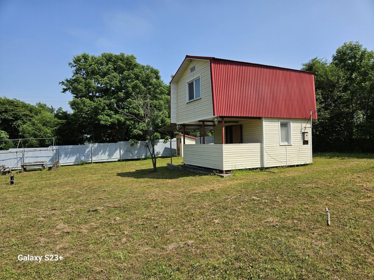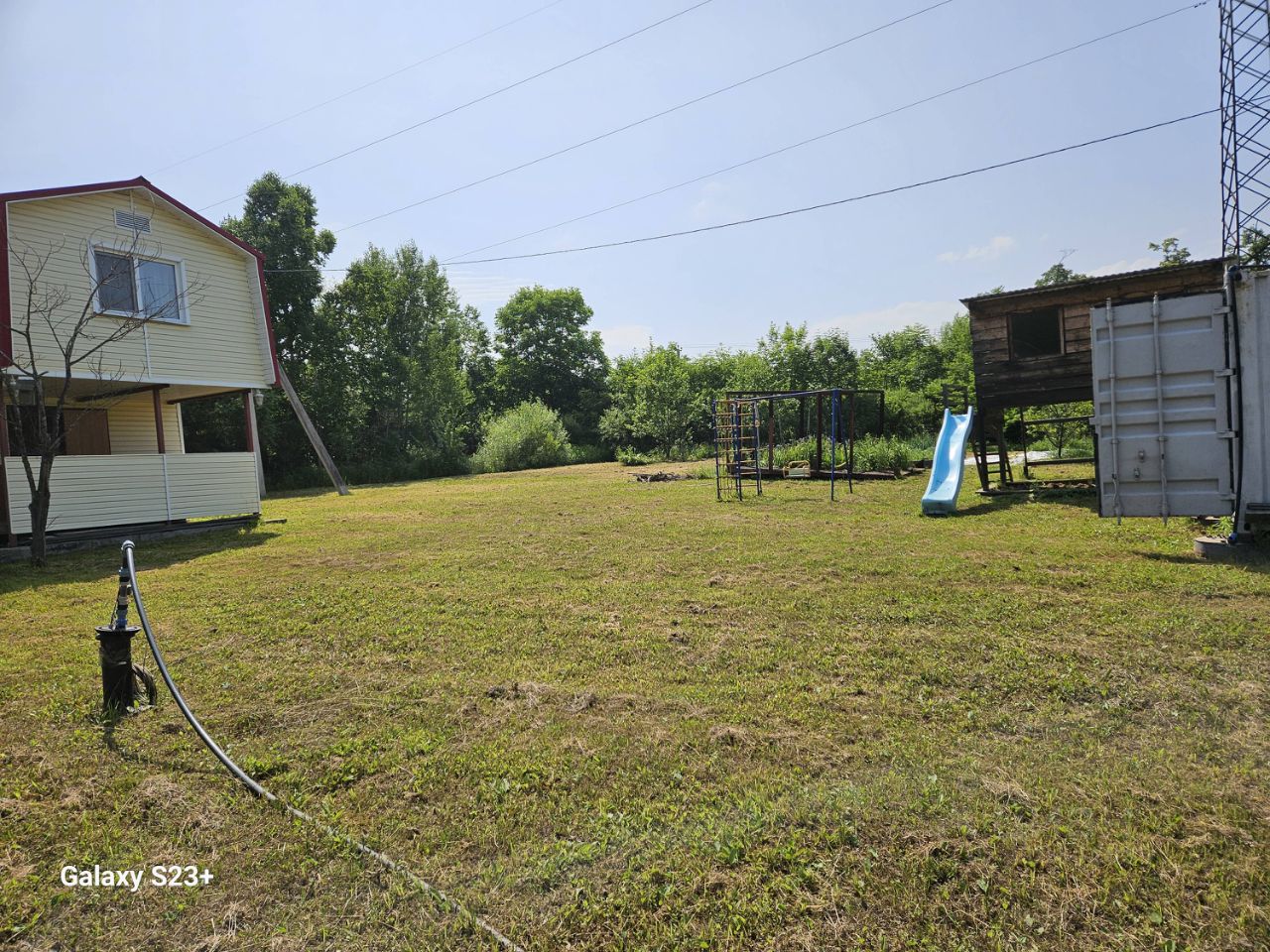 детская спортиная и развлекательная зона с безопасным домиком, горкой, качелями, песочницей, 20-ти футовый контейнер, в одной половине которого оборудовано место хранения садового инвентаря, а в другой полноценная душевая, с 200-литровой ёмкостью для воды. Есть несколько оборудованных грядок, посадки фруктовых деревьев.