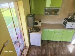 О доме: фундамент на лежачих сваях. 1-ый этаж из кирпича, отсевблока, утеплён каменной ватой. На нём располагается кухня, площадь-11.5 кв. м.. Пол из лиственницы, сверху линолеум. К дому пристроена терраса.