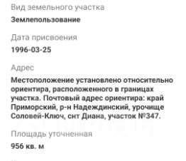 Продаётся участок в СНТ Диана(Соловей Ключ). Тихое,живописное место.Участок находится на возвышенности откуда открывается шикарный вид.Столб для подключения электроэнергии находится на границе участка(не нужно ставить дополнительные столбы,тянуть линии)-только заключить договор.Вода на небольшой глубине.Удобные подъездные пути для техники.Улица тупиковая,Вас не будут тревожить мимо проезжающие и проходящие зеваки.Удаленность от основной трассы 10 минут ,от Владивостока 45 минут.Участок имеет категорию-ЗЕМЛИ НАСЕЛЕННЫХ ПУНКТОВ(что значительно упрощает строительство своего уголка в гармонии с природой).ВРИ-САДОВОДСТВО.На участке естественная природная растительность,что позволит Вам воплотить все свои ландшафтные фантазии.