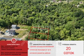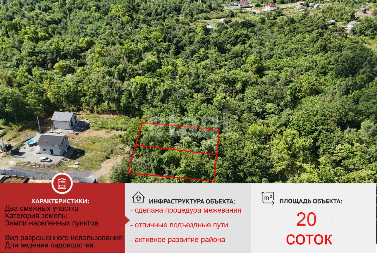 Агентство недвижимости "Этажи- Владивосток" предлагает к покупке два смежных земельных участка общей площадью 20 соток, расположенных в микрорайоне "Глобус", ст "Вишневый сад", участки 847а и 853. Участки находится вблизи коттеджного поселка "Дубрава", который стремительно развивается и застраивается новыми домами.