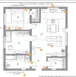 Планировка дома: 2 спальни, гардеробная, кладовая, совмещенный сан/узел и сердце дома- просторная гостиная с кухонной и обеденной зонами,