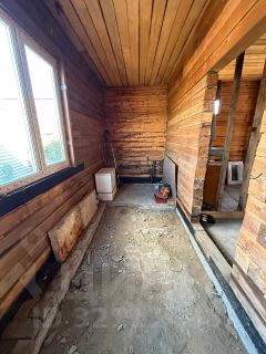 Дом расположен на участке в 15 соток с подведёнными коммуникациями: электричеством, водоснабжением из скважины и канализацией (септик, 5 кубов). Материал постройки — дерево, что обеспечивает особую атмосферу тепла и уюта. Высота потолков в 3 метра добавляет пространству воздуха и свободы. Фундамент ленточный на бурках, через каждые полтора метра, 22 бурки, фундамент армированный, бурки также армированные, все связано между собой. Первые три венца с лиственницы, по дому и веранде, остальные с ели, брус 15*15, полы залиты, стяжка. Крыша шатровая, можно сделать жилой или использовать как зону хранения.