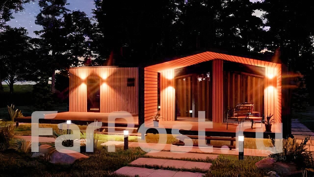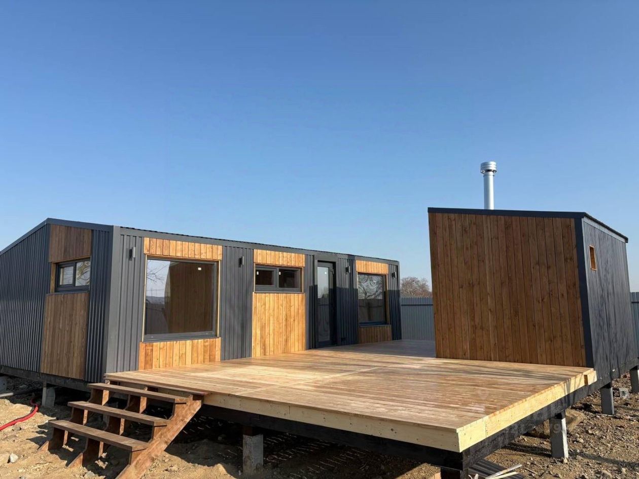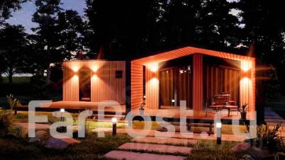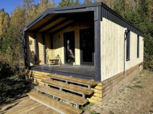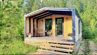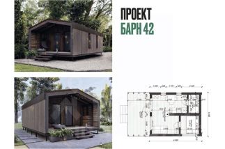Готовый дом БАРН 42. Общая площадь составляет 42 кг кв.м, высота потолков — 2,5 метра, а уютная терраса оснащена террасной доской из долговечной лиственницы.