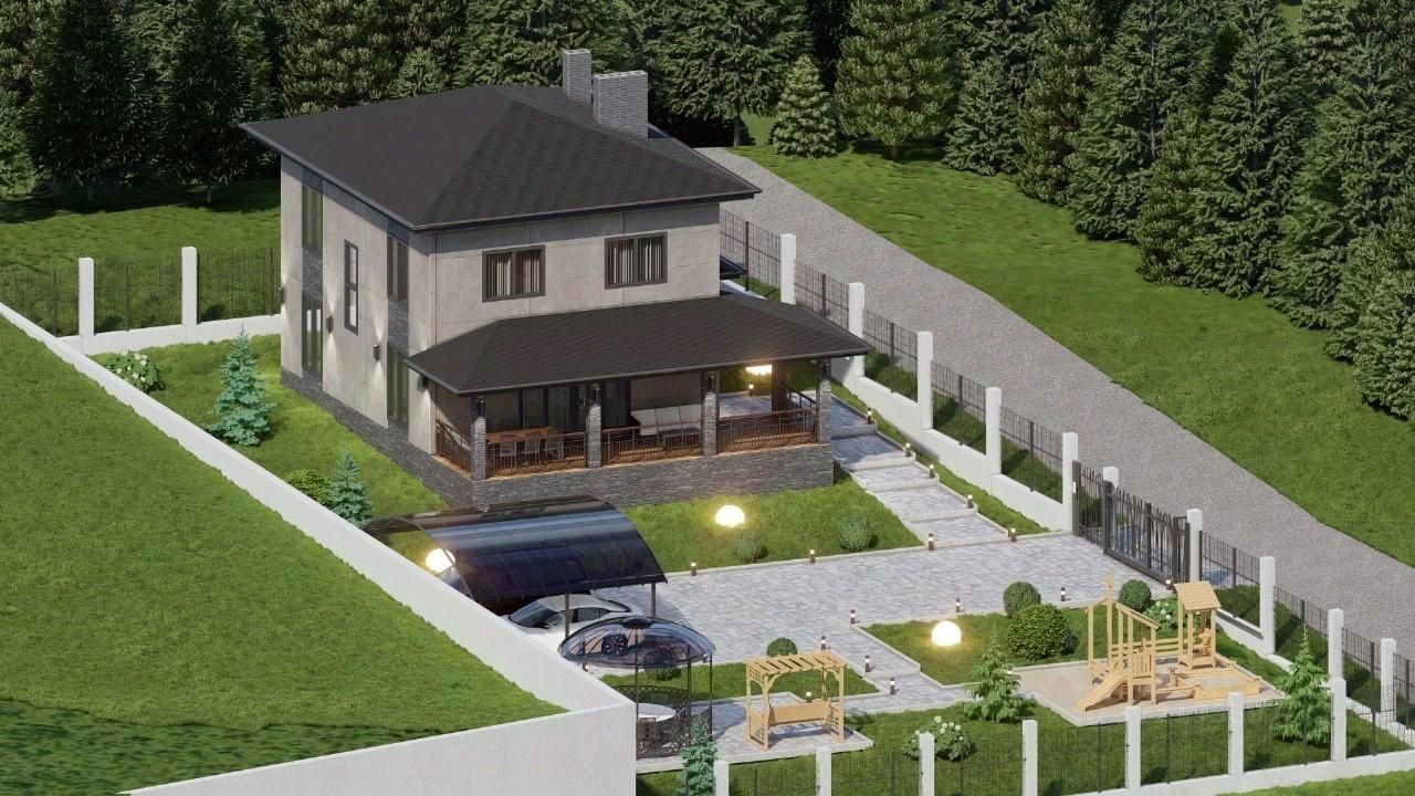 Участок ~10 соток позволяет разместить сад, зону барбекю, детскую площадку, парковку и при желании — небольшой бассейн.