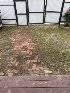 Вишня молодая. Клумба с цветами у террасы радует глаз.