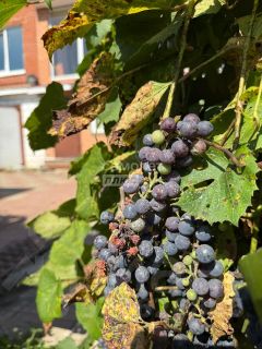 На участке растут как овощи, так и кусты ягод, по изгороди тянется стена винограда