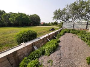 Территория по периметру укреплена опорной монолитной стеной, под забор установлены винтовые сваи. Хорошие подъездные пути.