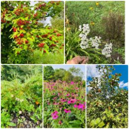 Плодовые деревья и кустарники-черноплодная рябина, калина, вишня, малина, жимолость, боярышник, черемуха.