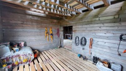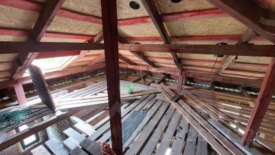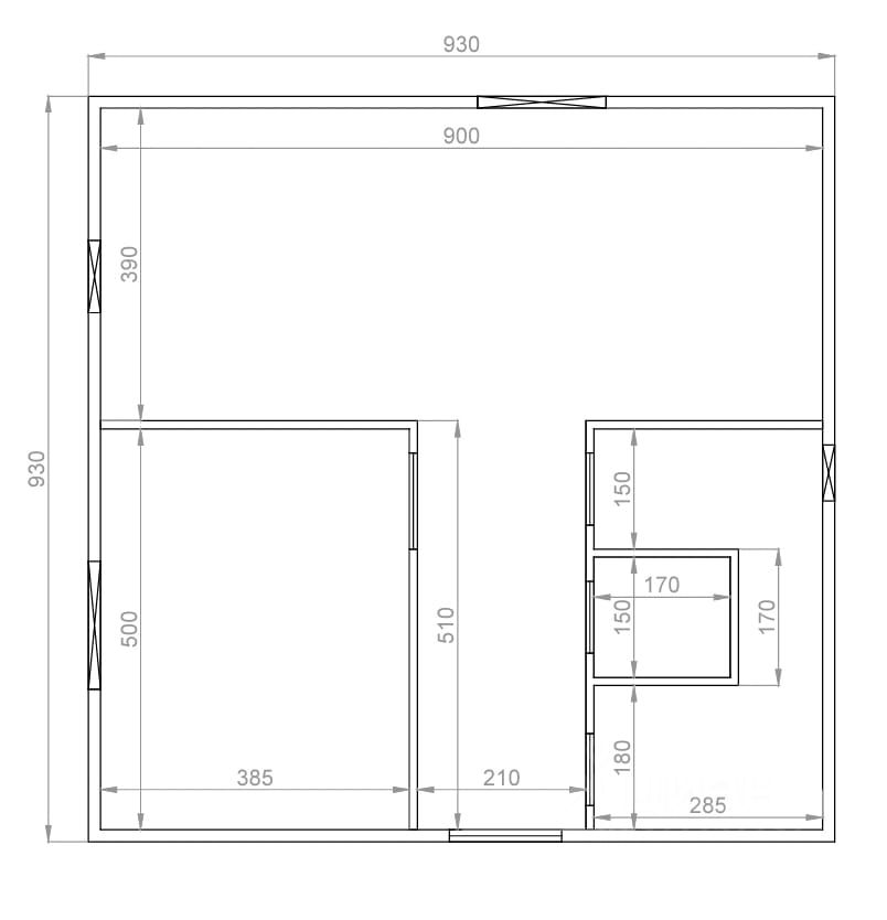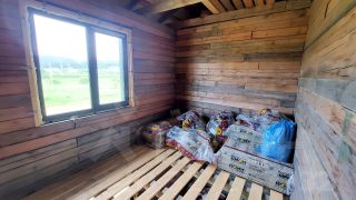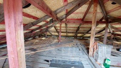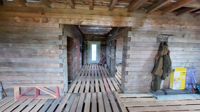 Материал стен: внешние стены - брус 150х150, внутренние стены - 150х100. При возведении стен брус обрабатывался огнебиозащитой, меж венцами укладывался межвенцовый утеплитель, брус крепился на нагеля размером 37,5 см (в 2,5 бруса).