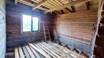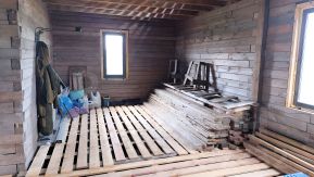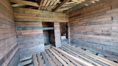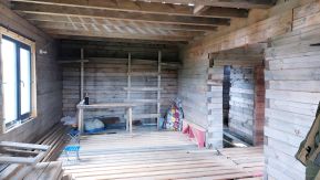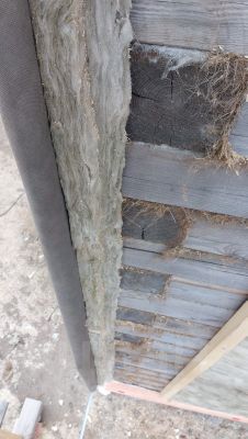 Внешние стены проконопачены после двух летней усадки, утеплены с наружной стороны минеральной ватой в толщену 100мм в два слоя в перехлест по 50мм. Обтянуты гидро-ветрозащитной мембраной Технониколь. Металосайдинг евробрус.